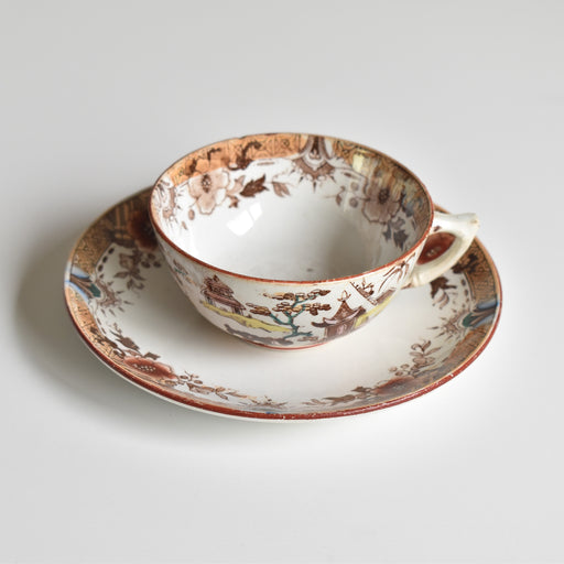 Brocante/蚤の市Sarreguemines窯のアンティークカップアンドソーサーKyotoシリーズです。 ジャポニズムへの敬愛が感じられる”Kyotoシリーズ”。 違った目線から見られた日本の風景や建物、人々の暮らし。当時の日本の慎ましさや奥ゆかしさをフランスのアンティークから感じられます。 カップ見込み部分に...