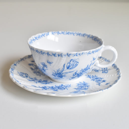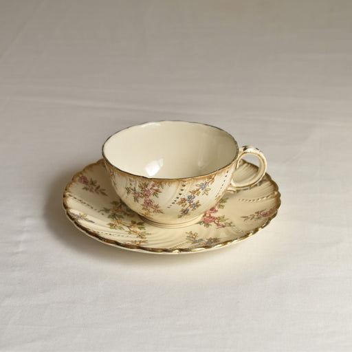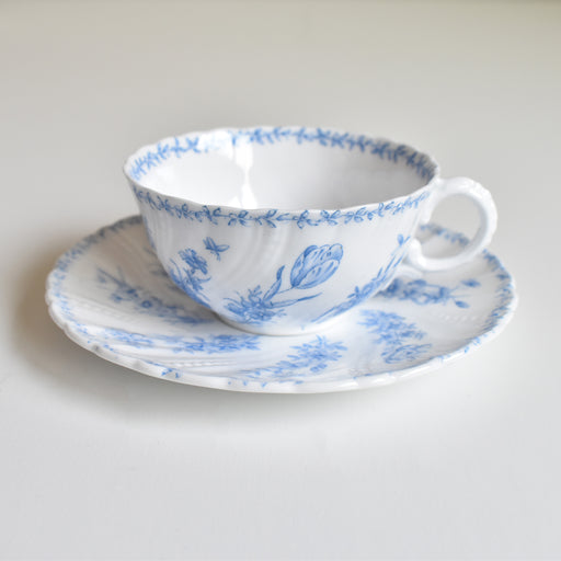 Brocante/蚤の市Sarreguemines窯のアンティークティーカップアンドソーサーです。 柔らかなレースのカーテンが風に靡くような美しいレリーフ。LouisXVシリーズと同じデザインです。 その上には、季節を感じる美しい花々が乗せられエレガントで上品な雰囲気。 ソーサーにカップを載せると、まるで水辺にに絵柄...