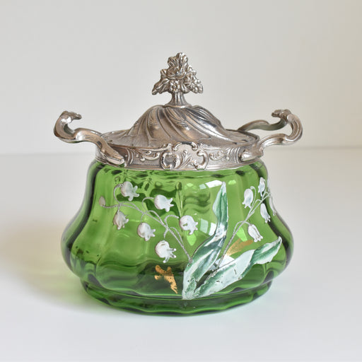 Brocante/蚤の市アンティークのビスケットジャー。 ユニークな形と鮮やかな緑のガラスが印象的です。エナメルで描かれた鈴蘭。ぷっくりと立体的でとても可愛らしく、素敵なビスケットジャーです。 状態:内側に小さい傷あとが見られますが目立ちません。いい状態です。 サイズ:15.5cm x15cm x高さ15cm(蓋なし...