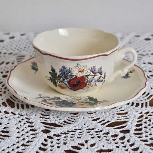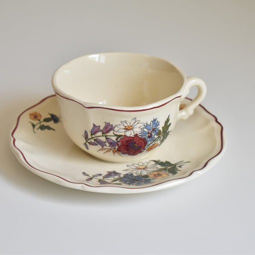 Brocante/蚤の市ヴィンテージのチョコレートカップ&ソーサー ディゴワン&サルグミンヌAgresteシリーズ のカップ&ソーサーです。 フランス語で ”Agreste”とは、田舎のもの、シンプルで素朴と言うような意味。 プレートに描かれているポピーやホタルブクロ、アザミや雛菊などのブーケは、フランスの田舎の風景...