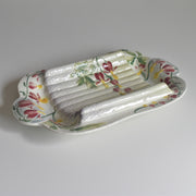 全体を柔らかなクリーム色でまとめつつ、その周囲には可愛らしい赤い花と緑の葉が手描きで描かれており、食卓に上品な華やかさを添えます。