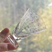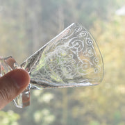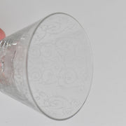 ボウル全体には、繊細で美しい花や唐草模様を思わせるグラヴィールが施されており、光を透かすと優雅な模様が浮かび上がり、見る角度によって異なる表情を楽しめます。