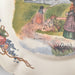 こちらのデザートプレートには、丘の上に建つ、白壁と赤い屋根が印象的な教会を背景に、アルザスの伝統衣装をまとった女性と子どもが道を行く、穏やかな情景が描かれています。