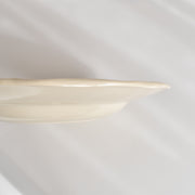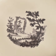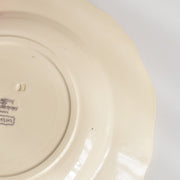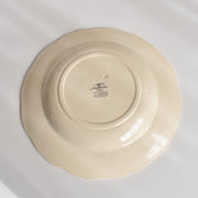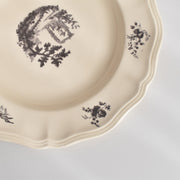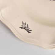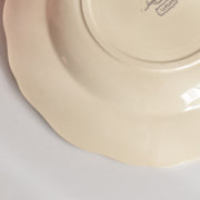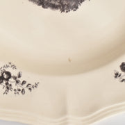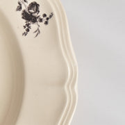 人気の花リム(フリル状の縁)が施された、温かみのあるクリームがかったアイボリー色の美しいプレートをベースに、シックな黒のトランスファー(転写)プリントが際立っています。