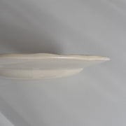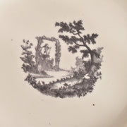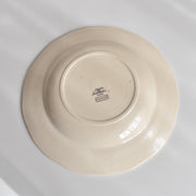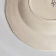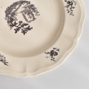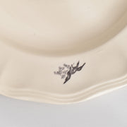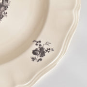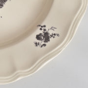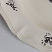 人気の花リム(フリル状の縁)が施された、温かみのあるクリームがかったアイボリー色の美しいプレートをベースに、シックな黒のトランスファー(転写)プリントが際立っています。