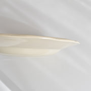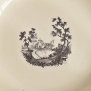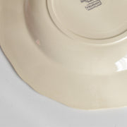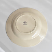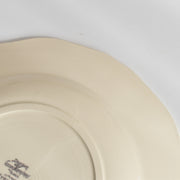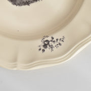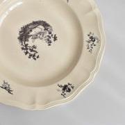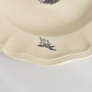 人気の花リム(フリル状の縁)が施された、温かみのあるクリームがかったアイボリー色の美しいプレートをベースに、シックな黒のトランスファー(転写)プリントが際立っています。
