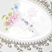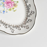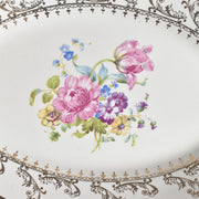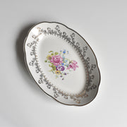 20世紀中期に作られたこの一枚は、温かみのある乳白色の肌に、繊細な金彩の縁取りと、生き生きとした花のプリントが美しく映えます。