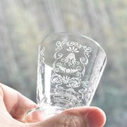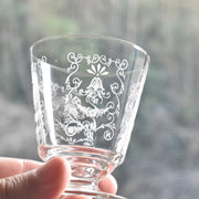 グラスのボウル全体に、植物のモチーフや優雅な曲線を用いたエッチング技法による細密な装飾が施されています。