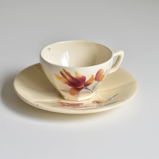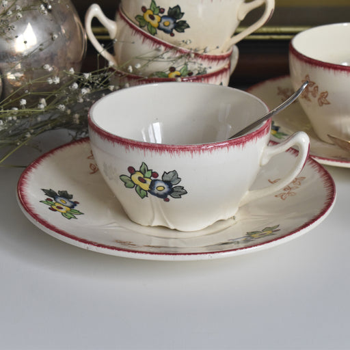 Brocante/蚤の市Longwy窯 (ロンウイー窯) のヴィンテージチョコレートカップ&ソーサーMarseille(マルセイユ)シリーズです。 手描きの花々が愛らしい、絵本に出てくるような温かみのあるデザインで、 手に取ると懐かしさと愛着が湧いてくる素敵なカップです。 状態:経年による貫入が見られ、縁に小さい...