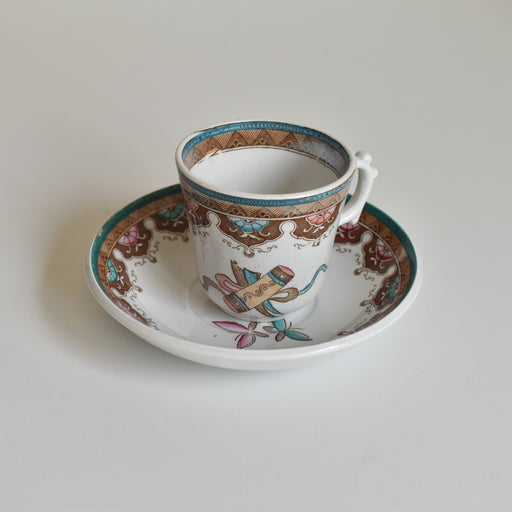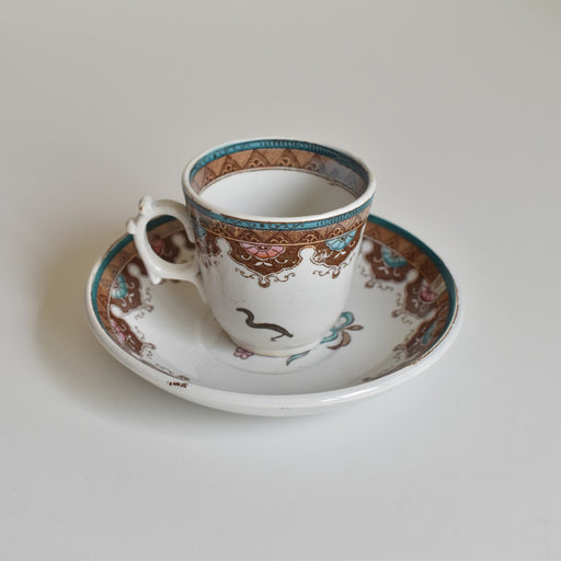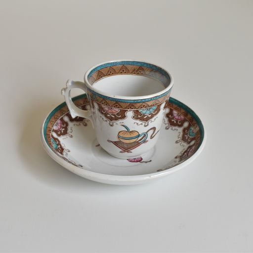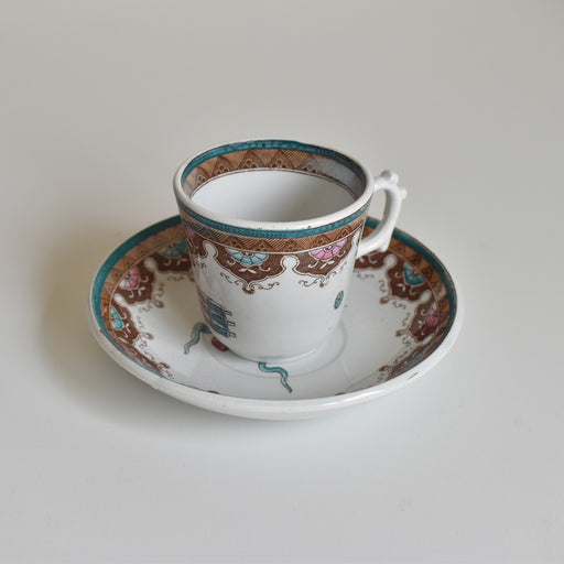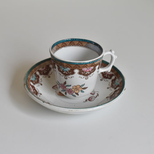 Brocante/蚤の市Sarreguemines窯のアンティークコーヒーカップアンドソーサーです。 デミタスサイズの可愛いらしいカップアンドソーサーです。 トランスファーの上からハンドペイントで色が載せられ、手の込んだデザイン。 シノワズリーやジャポニズムを感じさせるデザインで一枚一枚違う模様になっています。 キッ...