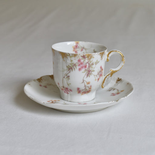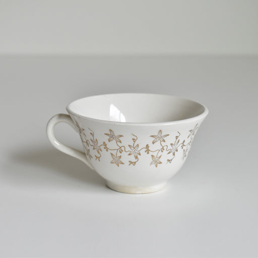 Brocante/蚤の市Digoin & Sarreguemines窯のヴィンテージコーヒーカップです。 シンプルなフォルムに金彩で描かれた蔓と花がよく生えます。 柔らかく可愛らしい雰囲気のカップです。 状態:とても細かい欠けのような傷が縁に見られますが使用感が少なめとてもいい状態です。 サイズ:10.3...