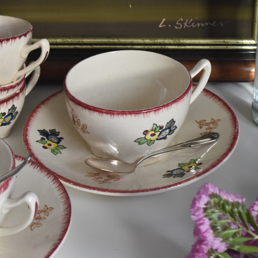 Brocante/蚤の市Stanley Charles Amisons窯 (スタンレー・チャールズ・アミソン窯) のアンティークカップ&ソーサートリオです。 鮮やかなオレンジのフラワーモチーフと、黒や深い赤茶で描かれた緻密な装飾が織りなすパターンは、当時の英国で流行した伊万里(Imari)風のデザイン。 シンプルで...