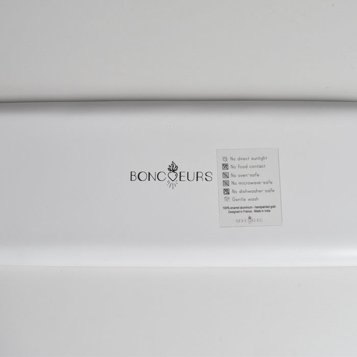 材質:アルミニウムにエナメル加工。縁ゴールド色でハンドペイントされています。