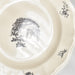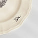人気の花リム(フリル状の縁)が施された、温かみのあるクリームがかったアイボリー色の美しいプレートをベースに、シックな黒のトランスファー(転写)プリントが際立っています。