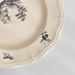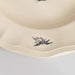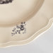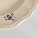 人気の花リム(フリル状の縁)が施された、温かみのあるクリームがかったアイボリー色の美しいプレートをベースに、シックな黒のトランスファー(転写)プリントが際立っています。