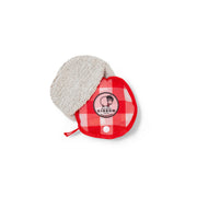 箱の中には、カマンベールに似せて編まれたニットポーチ。ニットポーチの中にはフランスの食卓を彷彿とさせる赤と白のギンガム柄のエコバッグが入っています。