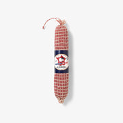 白と赤のウールでニットされたサラミ。赤と白の伸びる網と白のコットン食用紐で手縫されています。金属製のクリップもついています。 中材:ポリエステール タグ:紙 |
