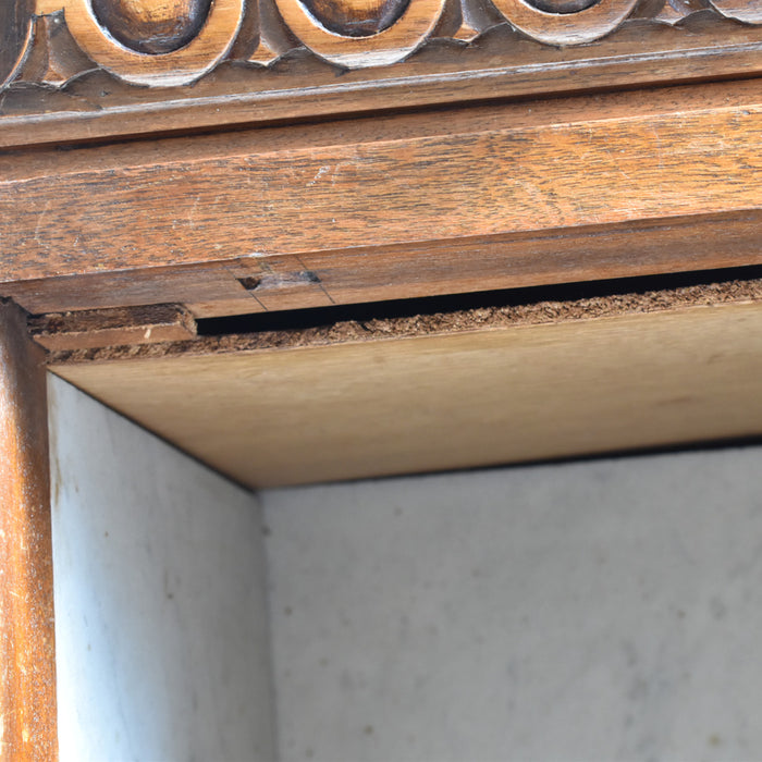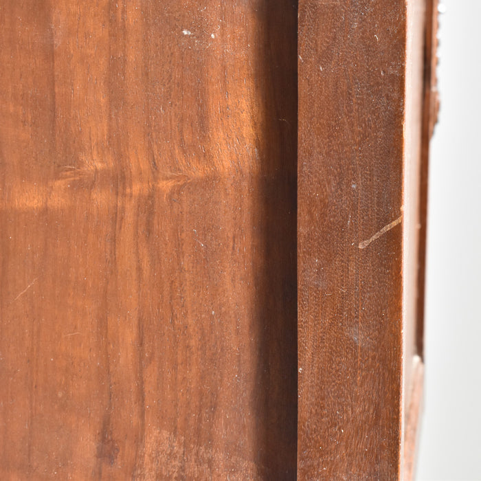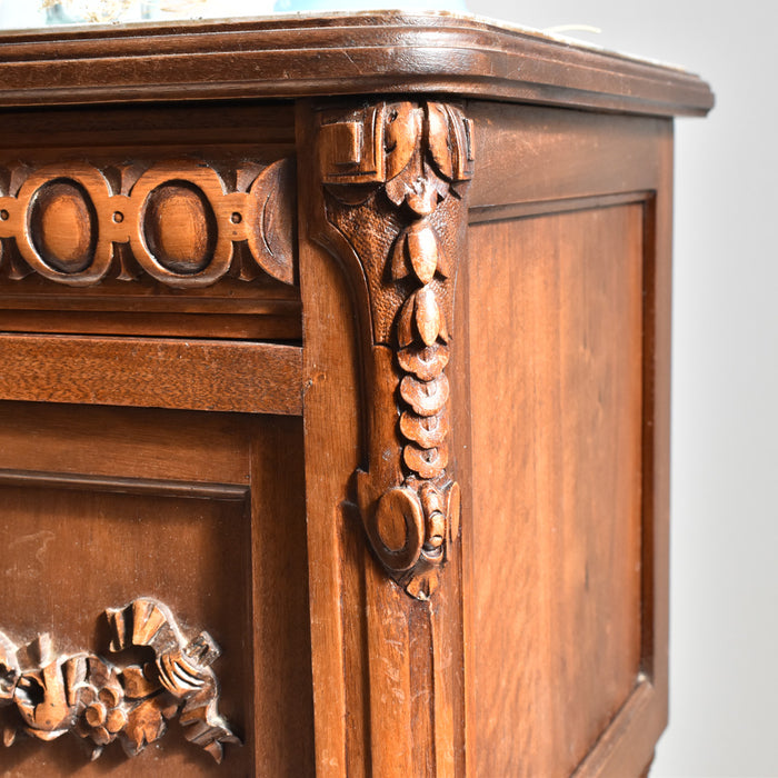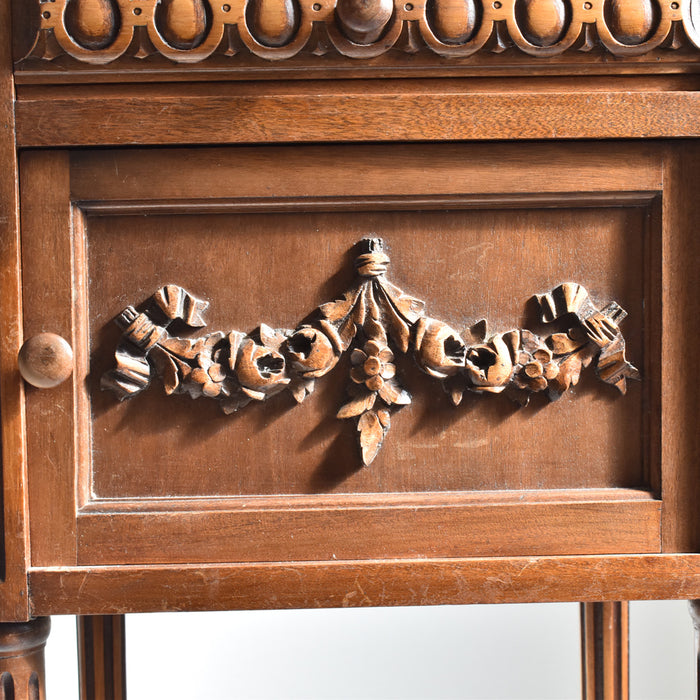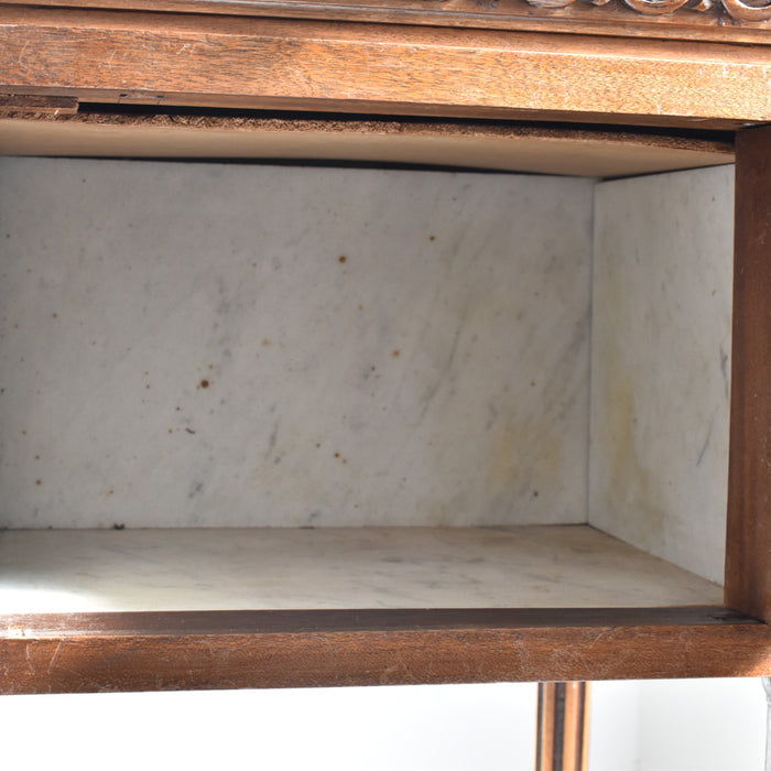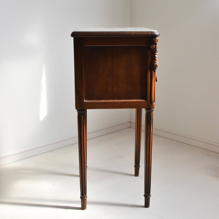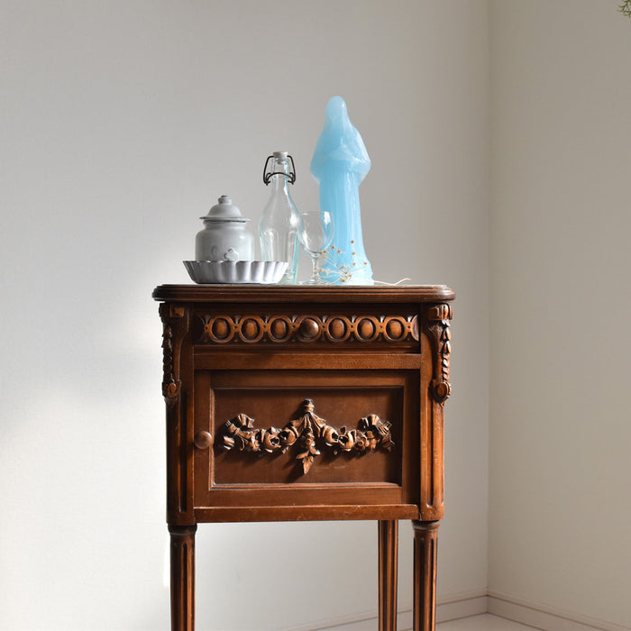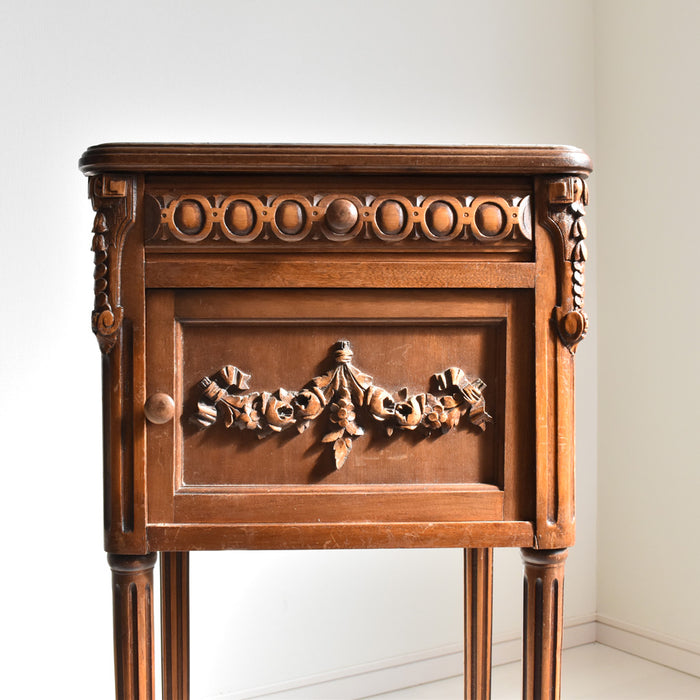 木彫りの模様も美しく、存在感たっぷりのナイトテーブルです。正面には、引き出しと小さな戸棚があり、収納もしっかりできます。