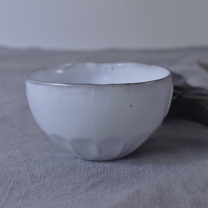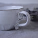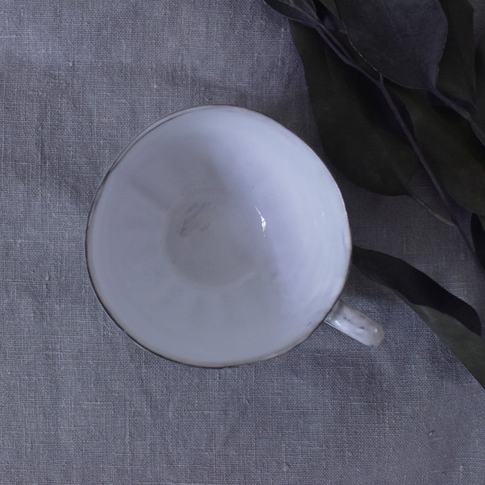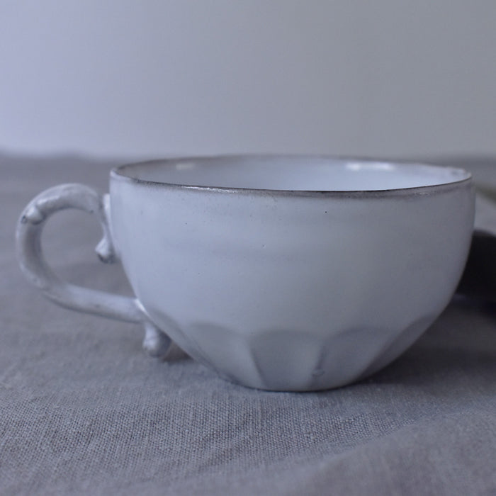 すぼまった底から、エレガントな印象を受けます。取っ手の部分が広く持ちやすいため、使い勝手も良いです。純白の釉薬から透けて見える土の色が素敵です。いくつか揃えて、ご家族やお友達とのティータイムにいかがでしょうか。