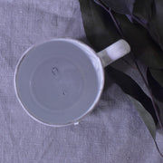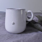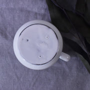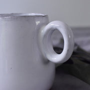卵のようなコロンとした形と取っ手が可愛いカップです。純白の釉薬をまとったカップは大ぶりながら華奢な印象です。厚みが少なく薄い作りのため軽く、口当たりも良いです。コーヒーやハーブティーを飲みながら、ゆったりとした時間を楽しみたい時にぴったりです。