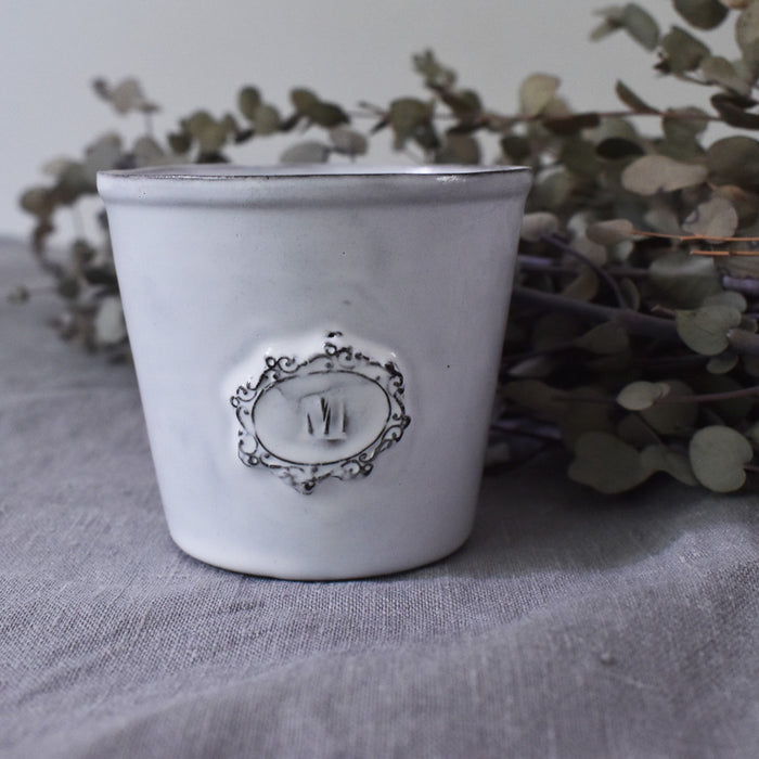 ワンポイントの装飾が、シンプルな佇まいにエレガントさを感じさせます。お気に入りの植物を入れてプランターとして使ったり、スティックシュガーを入れたり、ペーパーナプキンを丸めて入れ、テーブルに置いたりして楽しむこともできます。また、少し大きめのポットは、たっぷりとお茶を楽しみたい時に使用するのもおすすめです。