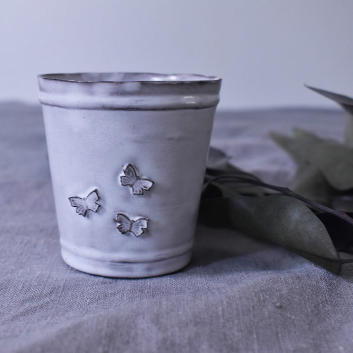 立体的なチョウが装飾されたゴブレットは、華奢で可憐なデザインです。日本の湯のみのような形は、手にするとなぜかほっとした気持ちにさせてくれます。飲み物を入れるだけでなく、スティックシュガーを立てたり、お気に入りのペンや小物を入れてデスクに置いても素敵です。