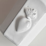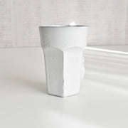 【黒い土と透き通る白】本体の黒い土と、表面の透き通るような白いエナメル(釉薬)のコントラストを存分に楽しむことができる一品です。