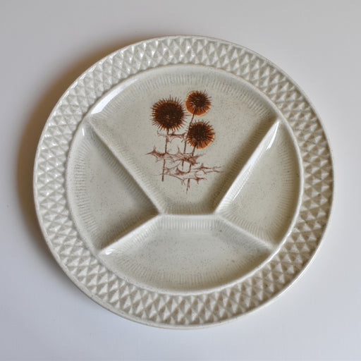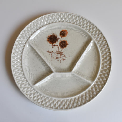 Brocante/蚤の市Sarreguemines窯のヴィンテージフォンデュプレートです。 プレートは4つに部屋分けされていて、フォンデュ用のソースを入れたり、取り分けたりするために、このような形になっています。 ワンプレートで盛り付ける際に便利です。 アザミの花が一枚一枚絵付けされています。縁にはダイヤ型のし...