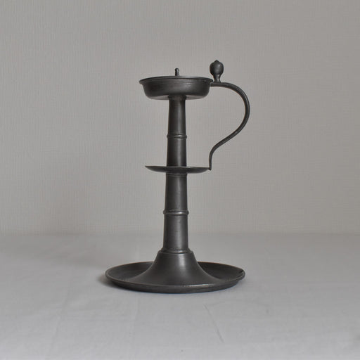 Brocante/蚤の市ヴィンテージのピューター製キャンドルホルダーです。 映画のワンシーンをイメージさせるような、火を灯したまま持ち運びができるように取手がついたスタイル。 トップには、窪みではなくキャンドルを刺す太めの針がついています。キャンドルの太さをあまり選ばず、直径6.2cmのキャンドルまでつけることができ...