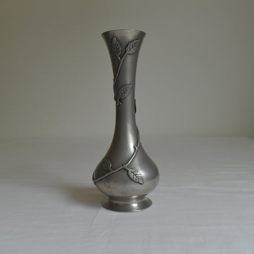 Brocante/蚤の市ヴィンテージのピューター製花瓶です。 Rose Designによる花器です。 すらっと伸びた首に蔦が沿うように装飾されています。 花を一輪挿すだけで華やかさを感じられそうです。 状態:多少の傷や汚れが見られます。 サイズ:直径10cm x 高さ24cm 年代:20世紀後半