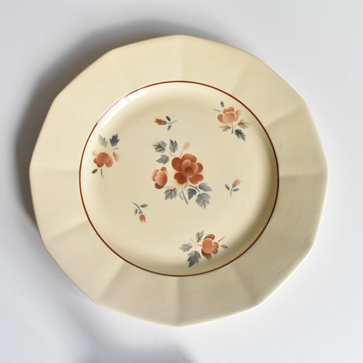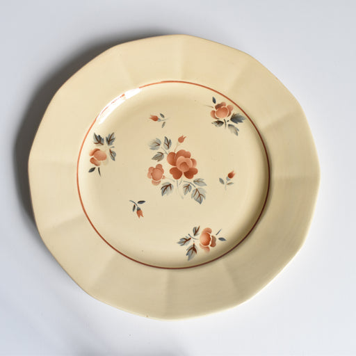 Brocante/蚤の市Digoin&Sarreguemines窯のヴィンテージプレートモデル8189番。 クリーム色のドデカゴン(12角形)のお皿にステンシルの青とオレンジの小さいバラが描かれています。 可憐さと温もりを感じる素敵な一品です。 状態:欠けやひびがなく使用感もほとんどなくとてもいい状態で...