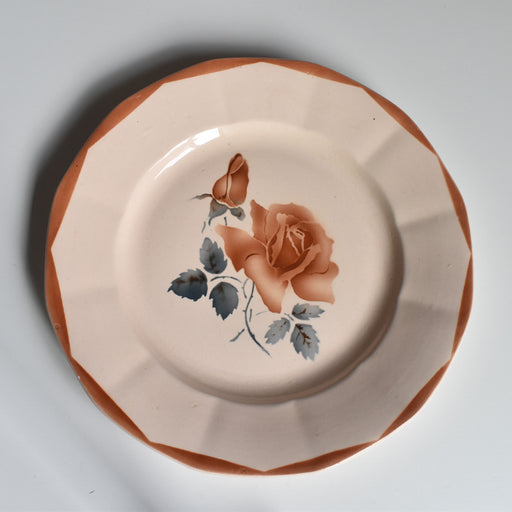 Brocante/蚤の市Digoin&Sarreguemines窯のヴィンテージプレート9181シリーズです。 優しく淡いピンクに、朝露に濡れたようなしっとりとしたバラ。 ぼやけ過ぎないよう色付けされたリムも遊び心があって素敵です。 柔らかく優しい印象のプレートです。 状態:1mm程度の欠けが縁に見られ...