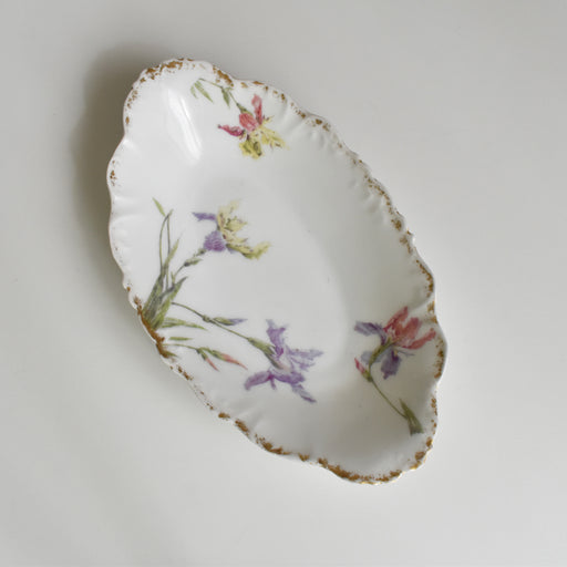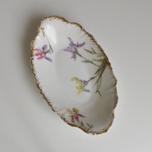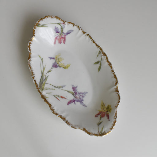 Brocante/蚤の市Limoges Elite窯のアンティークラヴィエです。 Eliteは主にリモージュの食器をアメリカに輸入していたアメリカの会社Bawo&Dotterがリモージュに作った窯です。 縁にレリーフと金彩が解かされていて綺麗な色のあやめが数本咲いています。 状態:金彩が少し薄くなっていま...