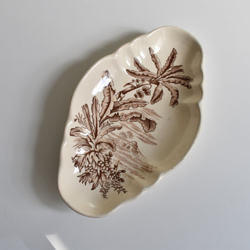Brocante/蚤の市Longchamp窯のアンティークラヴィエExotiqueシリーズの茶色です。 暖かさを感じさせるレリーフ。絵柄の雰囲気ととてもよく合います。 当時の人々が感じる”Exotique”エキゾチックを想像しながら眺めると、また違った表情を楽しめておすすめです。 状態:縁裏に欠けが見られますが表...