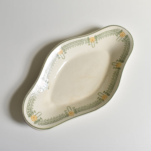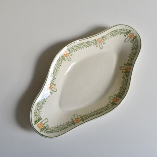 Brocante/蚤の市U&C Sarreguemines窯のアンティークのレクタングル大皿Molièreシリーズです。 深いグリーン色の花の模様と、レクタングルのフォルムが相まって、どこかモダンな印象もうけるシリーズ。 裏にはシミが広がり、アンティークの柔らかな風合いも楽しめる一品です。 レクタングルの大皿...