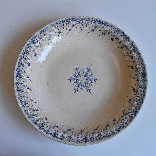 Brocante/蚤の市Longwy釜のアンティーク深皿Chartresシリーズです。 状態:多少のカトラリー跡や貫入、シミが見られます。裏に製造の際にできた跡ががございます。 サイズ:直径23cm x高さ2cm 年代:19世紀終わり〜20世紀はじめ