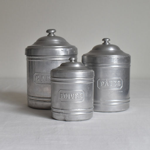 Brocante/蚤の市アルミニウム キャニスターの3点セットです。 明るいシルバーの色が光を反射させ、部屋を明るい印象に変えます。キッチンボードにそのまま置いたり、テーブルにアクセントとして置いたりするなどインテリアとしてお楽しみいただけます。 Tournus社のマークがあるで確認できます。 傷や擦れがございます...