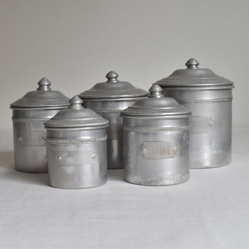Brocante/蚤の市アルミニウム キャニスターの5点セットです。 明るいシルバーの色が光を反射させ、部屋を明るい印象に変えます。キッチンボードにそのまま置いたり、テーブルにアクセントとして置いたりするなどインテリアとしてお楽しみいただけます。 傷や擦れがございますが、ヴィンテージ特有の風合いをお楽しみいただけま...