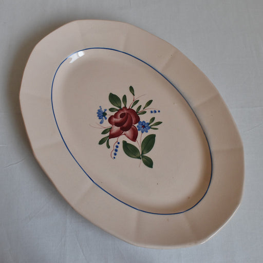 Brocante/蚤の市ヴィンテージの オーヴァル 大皿 ディゴワン&サルグミンヌ 淡いピンクのプレートがとても優しい印象に。 手描きされた花々からは、作り手の柔らかな筆のタッチが伝わってきます。その周りには、ブルーの華奢なラインが引かれ、程よく空間を引き締めるいい存在感に。 テーブルセンターにしたり、果物をその...