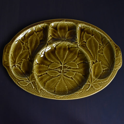 Brocante/蚤の市ヴィンテージのジアン オーヴァル大皿 バルボティーヌです。 バルボティーヌ製法でつくられた大皿にはマロニエのモチーフが施されています。フランスでは、街路樹として栗によく似た実をつけるマロニエが植えられています。 マロニエの花言葉は「贅沢」 何枚も重なり合った葉の立体感が見事に表現されていま...