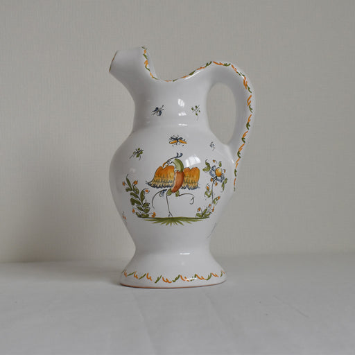 Brocante/蚤の市ヴィンテージのピッチャー、ムスティエ焼きです。 黄緑とオレンジを基調にした明るい色使い。 丸みを意識して形作られたピッチャーと鮮やかな色調がよく合います。 ムスティエの伝統的な絵柄であるパラダイスの鳥や、ルイ16世が気に入っていたジャガイモの花など、可愛らしい生き物や植物が表情豊かに手描きされ...