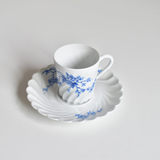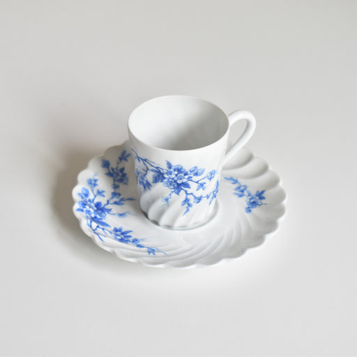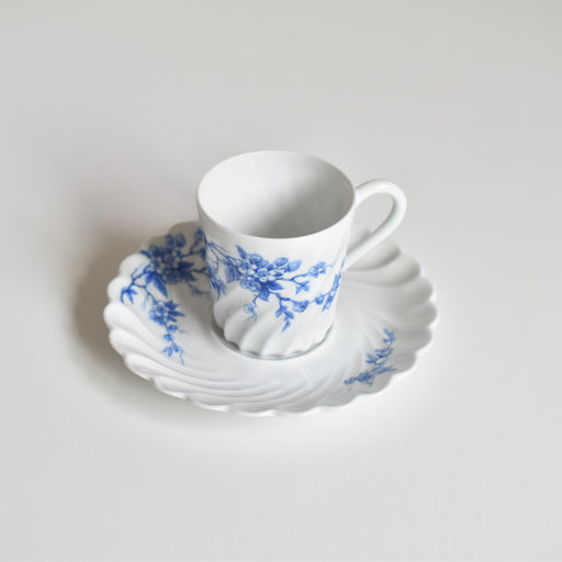 Brocante/蚤の市Limoges Haviland窯のヴィンテージコーヒーカップ&ソーサーです。 清楚な雰囲気を醸し出す美しいブルーアンドホワイト。 滑らかな曲線のレリーフは、まるでカーテンが風に靡くよう。心地よい動きを感じる素敵なデザインです。 Cerisier Bleuとは、青いさくらのこと。可愛らしい小...