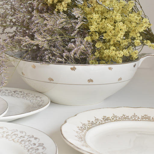 Brocante/蚤の市Digoin & Sarreguemines窯のヴィンテージサラダボウルNicoシリーズです。 シンプルな白地の縁に金彩の小花が施されている。シンプルで上品なシリーズです。 状態:金彩部分が少し薄くなっている部分もございますが使用感がなくとてもいい状態です。 サイズ:33cm x...
