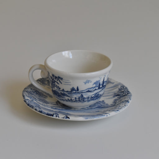 Brocante/蚤の市Luneville窯のヴィンテージコーヒーカップ&ソーサーenglish Styleシリーズです。 イギリスののどかな田舎の風景が描かれたイングリッシュスタイル。 広々と広がる風景には、水辺の花や小さな小屋、奥には教会のような建物が見えます、物語を感じさせます。 素敵な絵柄を眺めながらティ...