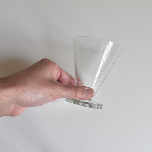 Brocante/蚤の市可憐で繊細な装飾が施された、フランスのヴィンテージグラスです。 グラスのボウル全体に、植物のモチーフや優雅な曲線を用いたエッチング技法による細密な装飾が施されています。 光にかざすと、白い線で描かれたような模様が浮かび上がり、その職人技に目を奪われます。 リキュールや食前酒、またはアペリテ...