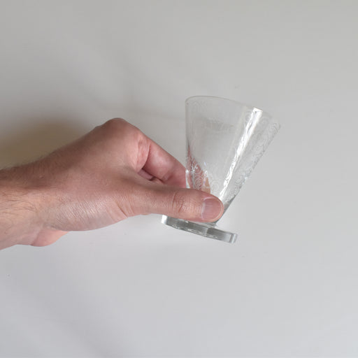 Brocante/蚤の市八角形のフット(脚部)が印象的な、ヴィンテージのスモールワイングラスです。メーカーは不明ですが、その佇まいからは丁寧な手仕事と品質の高さが伺えます。 ボウル全体には、繊細で美しい花や唐草模様を思わせるグラヴィールが施されており、光を透かすと優雅な模様が浮かび上がり、見る角度によって異なる表情を...