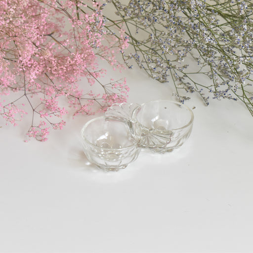 Brocante/蚤の市20世紀初頭から中期にかけて製造されたとみられる、フランスのウーラン(Oullins)社製のプレスガラス製ヴィンテージソルト&ペッパー入れです。 3つの小さな器が一体となったユニークなデザインで、中央には持ち手がついており、食卓での使い勝手も考慮されています。 ガラスの表面には繊細な縦縞のプ...