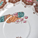 トランスファーの上からハンドペイントで色が載せられ、手の込んだデザイン。
