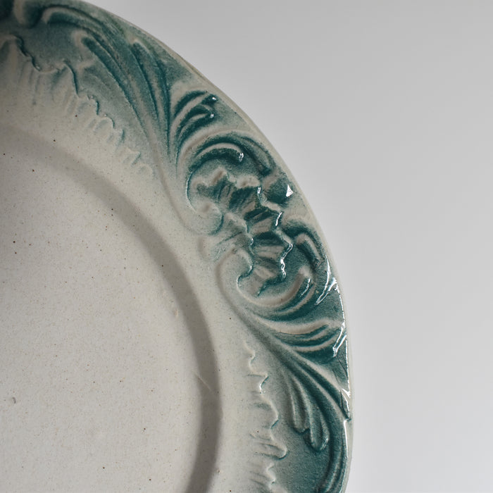 立体感のある縁のレリーフにグリーンの色が重なり、より柄がはっきりと感じられます。シンプルでありながら存在感のあるプレートです。