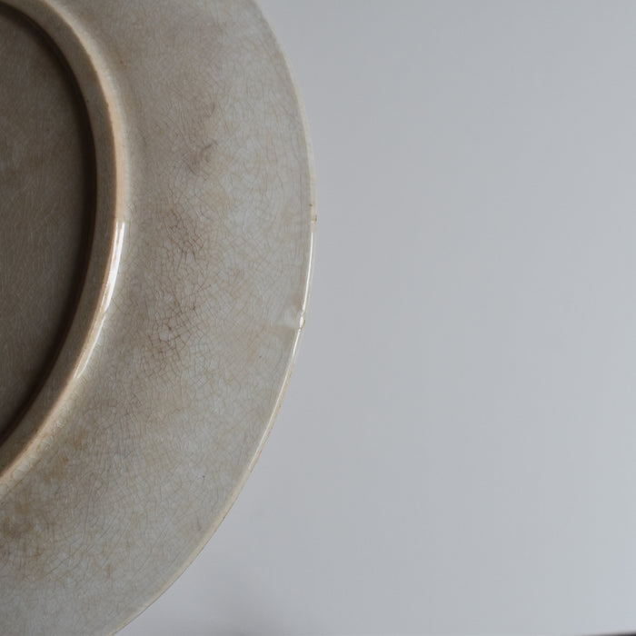 状態:たっぷりtの細やかな貫入と着色、カトラリー跡が見られます。縁に欠けのような凹みがありますが、上から釉薬がかかっています。アンティークの雰囲気をお楽しみいただけるプレートです。